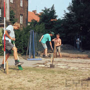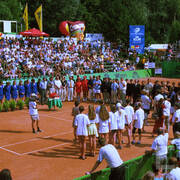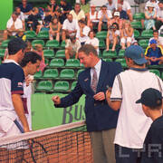 Losowanie kortów przed meczem finałowym Polish Open 1999 w grze podwójnej między Massimo Ardinghi/Davide Sanguinetti a Hugo Armando/Andriej Czerkasow na kortach tenisowych KS Olimpia (dzisiaj Park Tenisowy Olimpia)