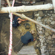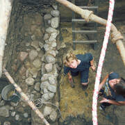 Badania archeologiczne prowadzone pod kierunkiem prof. Hanny Kóčki-Krenz na Ostrowie Tumskim przy kościele Najświętszej Marii Panny, widoczny relikt fundamentu ściany zachodniej palatium
