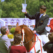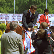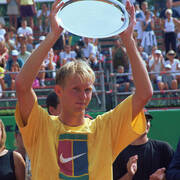 Fredrik Jonsson prezentuje nagrodę za zajęcie II miejsca w grze pojedynczej Polish Open 1999 na kortach tenisowych KS Olimpia (dzisiaj Park Tenisowy Olimpia)
