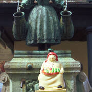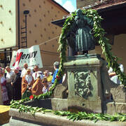 Studzienna Bamberki udekorowana kwietną girlandą w czasie Święta Bamberskiego na Starym Rynku