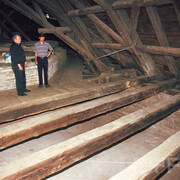 Proboszcz ks. Wojciech Wolniewicz i Jerzy Borwiński na poddaszu kolegiaty farnej