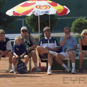Wojciech Fibak (trzeci od prawej) wśród kibiców meczu finałowego Polish Open 1999 w grze pojedynczej między Galo Blanco a Fredrikiem Jonssonem na kortach tenisowych KS Olimpia (dzisiaj Park Tenisowy Olimpia)