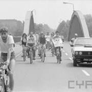 Happening rowerzystów na moście św. Rocha z okazji "Dnia bez samochodu", po lewej w tle budynek Wydziału Inżynierii Lądowej i Transportu Politechniki Poznańskiej, po prawej fragment kościoła św. Rocha