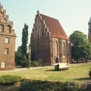 Widok z gzymsu południowej ściany kolegiaty farnej w kierunku południowo-wschodnim, w głębi kościół Franciszkanów (Bernardynów)