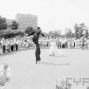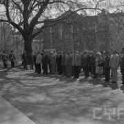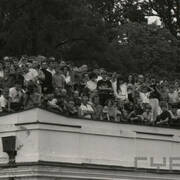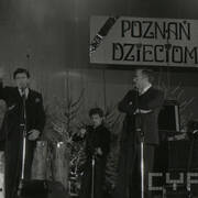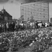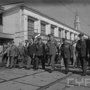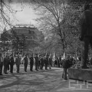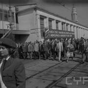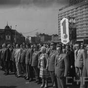 Trybuna honorowa pierwszomajowego pochodu przy ul. Głogowskiej, na skraju parku Kasprzaka (dzisiaj park Wilsona)