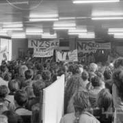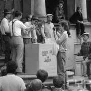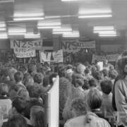 Protest w holu Collegium Maius przy ul. Fredry po odmowie rejestracji Niezależnego Zrzeszenia Studentów