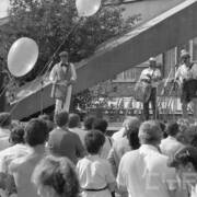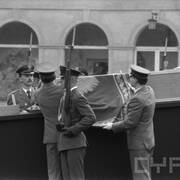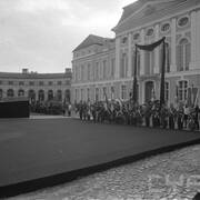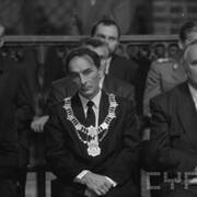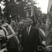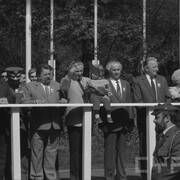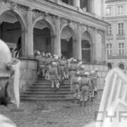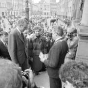 Spotkanie władz miasta z delegacją samorządowców z Niemieckiej Republiki Demokratycznej (?) na schodach ratusza na Starym Rynku, drugi od prawej z kluczami do miasta stoi prezydent Poznania Andrzej Wituski