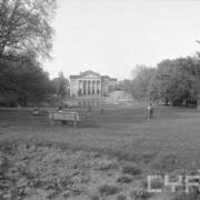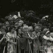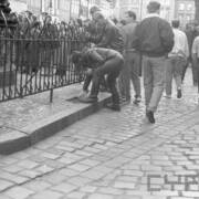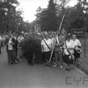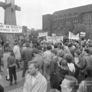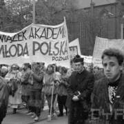 Przejście uczestników obchodów siedemdziesięciolecia Uniwersytetu Poznańskiego z Auli Uniwersyteckiej do Pałacu Kultury (dzisiaj CK Zamek), gdzie otwarto wystawę "Uniwersytet Poznański 1919-1989"