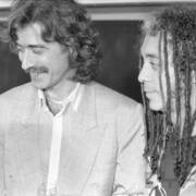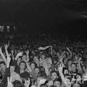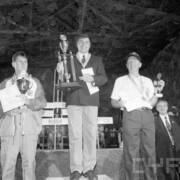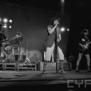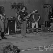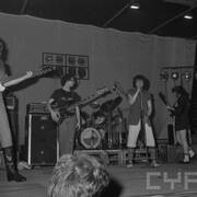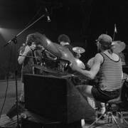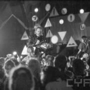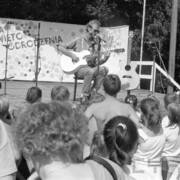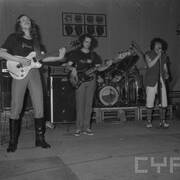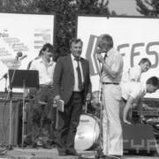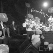Zbigniew Górny (na pierwszym planie), Jacek Skubikowski i Mietek Szcześniak (siedzą od lewej) w czasie koncertu Sceny debiutów