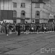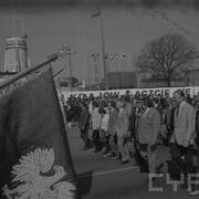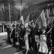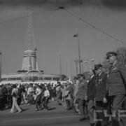 Młodzież z Ochotniczych Hufców Pracy przed trybuną honorową na pochodzie pierwszomajowym