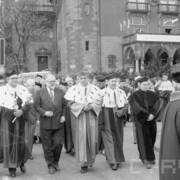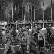 Harcerze przed trybuną honorową na pochodzie pierwszomajowym