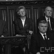 Prezydent RP Lech Wałęsa, za nim marszałek Sejmu Wiesław Chrzanowski, prezes Rady Ministrów Hanna Suchocka i marszałek Senatu August Chełkowski na mszy św. pogrzebowej Edwarda hr. Raczyńskiego, prezydenta RP na uchodźstwie, w katedrze