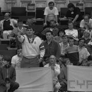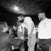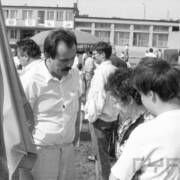 Wywiad z kandydatem do Sejmu Felicjanem Rożynkiem (siedzi tyłem pierwszy z prawej) w czasie wiecu wyborczego na stadionie WKS Grunwald Poznań