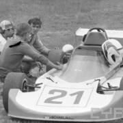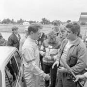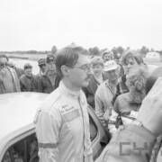 Piotr Kolasiński (Automobilklub Wielkopolski), zwycięzca 2. eliminacji Wyścigowych Samochodowych Mistrzostw Polski na Torze Poznań w klasie 3, rozmawia z dziennikarzem sportowym TVP Czesławem Kaliszanem