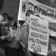Protest przed Collegium Maius przy ul. Fredry po odmowie rejestracji Niezależnego Zrzeszenia Studentów