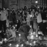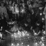 Manifestacja antyaborcyjna przed kościołem Najświętszego Zbawiciela przy ul. Fredry pod koniec lat 80. XX wieku