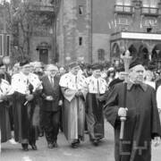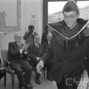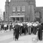 Pochód przed Aulą Uniwersytecką w czasie obchodów siedemdziesięciolecia Uniwersytetu Poznańskiego, uroczystościom przewodzili rektorzy poznańskich uczelni, a gościem honorowym był minister edukacji narodowej prof. Jacek Fisiak