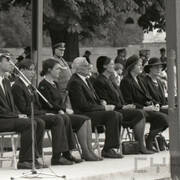 Minister spraw zagranicznych Krzysztof Skubiszewski (z lewej) i szef Kancelarii Prezydenta RP Janusz Ziółkowski (po prawej) na mszy św. pogrzebowej Edwarda hr. Raczyńskiego, prezydenta RP na uchodźstwie, w poznańskiej katedrze