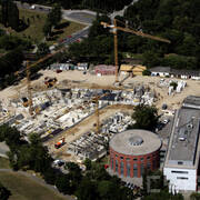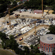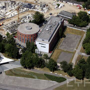 Wyższa Szkoła Nauk Humanistycznych i Dziennikarstwa (od 2014 roku Collegium Da Vinci) z lotu ptaka, po lewej trwa budowa osiedla mieszkaniowego (zespołu apartamentowców)
