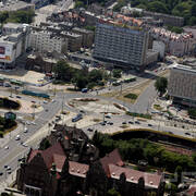 Rondo Kaponiera z lotu ptaka, na pustym placu przed zabytkowym budynkiem starej drukarni od 2017 roku stoi wieżowiec Bałtyk