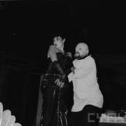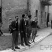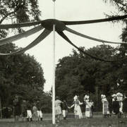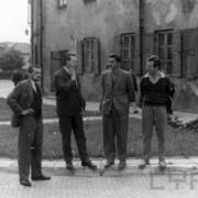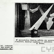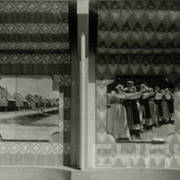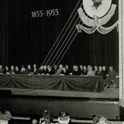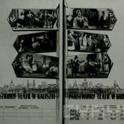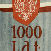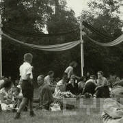 Dekoracja plastyczna pikniku z loterią książkową zorganizowanego z okazji setnej rocznicy śmierci Adama Mickiewicza, w tle zespół w wielkopolskich strojach ludowych1955
