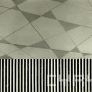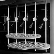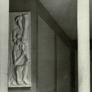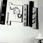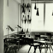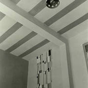 Fragment ściany z boazerią, lampami punktowymi i dekoracją w technice sgraffito o motywach geometrycznych nawiązującą do rzutów mebli w sklepie meblowym przy Al. Marcinkowskiego1960–1964