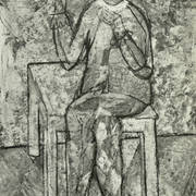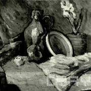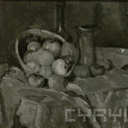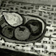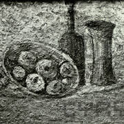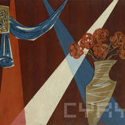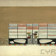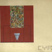 Projekt ściany ze sceną figuralną z owocami i wazą ceramiczna na trójnogu utrzymany w stylistyce lat 50. XX wieku, może stanowić część poprzednich dekoracji (CYRYL_4_2_1_3_0038 i CYRYL_4_2_1_3_0039) wnętrza sklepu lub ekspozycji1957–1960