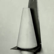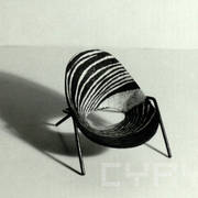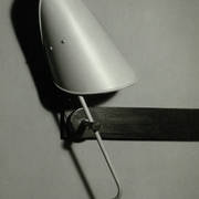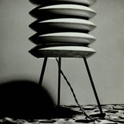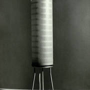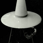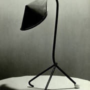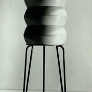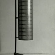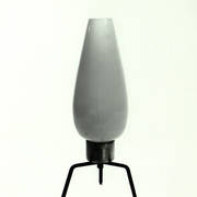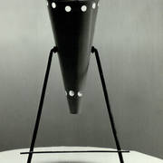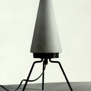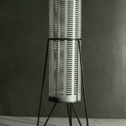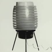 Lampa z kloszem harmonijkowym, na rurkowym trójnogu projektu Ryszarda Kulma, wzór 56/M nawiązujący do żelbetonowych konstrukcji architektury postmodernizmu1959–1964