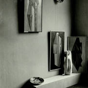 Salon grupy "EF", obrazy "Arlekin" i martwa natura z kwiatami Ryszarda Kulma, abstrakcje geomentryczne Ryszarda Skupina (?), meblościanka i ceramika nieznanych autorów oraz taboret projektu Ryszarda Kulma1957