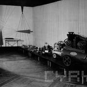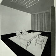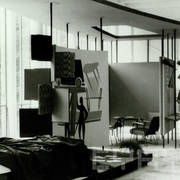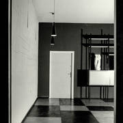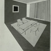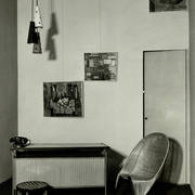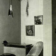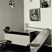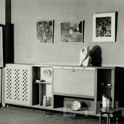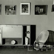 Salon grupy "EF", meblościanka nieznanego autora, fotel Ryszarda Kulma, trzy abstrakcje geometryczne Ryszarda Skupina (?), martwa natura z kwiatami Ryszarda Kulma, lampy Ryszarda Kulma i ceramika nieznanego autora1957