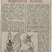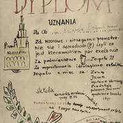 Dowcipny dyplom autorstwa Ryszarda Skupina dla Ryszarda Kulma, szefa Zespołu 22 z podziękowaniem za projekt i opracowanie Wystawy Produkcji i Postępu Technicznego Krajowego Związku Spółdzielni Sprzętu Medycznego w Warszawie1959–1960