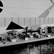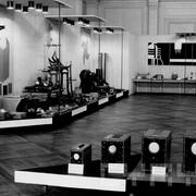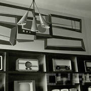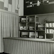 Fragment wnętrza sklepu RTV z ladą sklepową i widocznymi na półkach odbiornikami radiowymi, na ścianie dekoracyjne panneau o wzorach abstrakcyjno-geometrycznych1959–1961