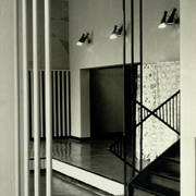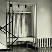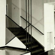 Wnętrze sklepu meblowego (ujęcie ze schodami) przy Al. Marcinkowskiego, silnie zrytmizowana przestrzeń nowoczesnego wnętrza podkreślona kontrastami barw1960–1964