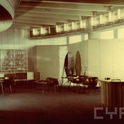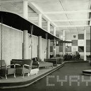 Stoiska wystawowe przeznaczone pod usługi z szyldem i logo Centralnego Zarządu Handlu Meblami w pawilonie nr 14 na XXVIII Międzynarodowych Targach Poznańskich1959