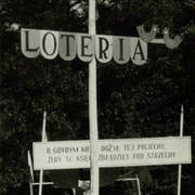 Dekoracja stoiska loterii książkowej ze znanym dwuwierszem z "Pana Tadeusza" propagującym masowe czytelnictwo na pikniku zorganizowanym z okazji setnej rocznicy śmierci Adama Mickiewicza1955