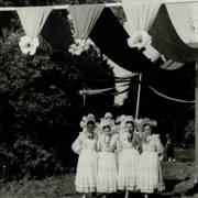 Dziewczyny w wielkopolskich strojach ludowych oraz dekoracja plastyczna pikniku z loterią książkową zorganizowanego z okazji setnej rocznicy śmierci Adama Mickiewicza1955