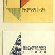 Utrzymany w stylu abstrakcji geometrycznej projekt okładki "Succi Herbarium Recentes/Soki ziołowe" Wielkopolskiej Wytwórni Produktów Zielarskich (prawdopodobnie ostateczna wersja)1960–1963