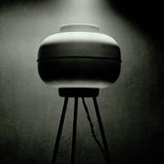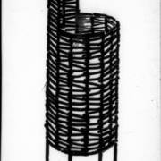 Lampa stojąca projektu Ryszarda Kulma, wzór 82/M z beczułkowatym kloszem na tralkowej podstawie o trzech nóżkach, łączy dawne wzornictwo lamp naftowych z funkcjonalną prostotą nowoczesności przełomu lat 50. i 60. XX wieku1960–1964