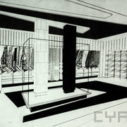 Projekt wnętrza sklepu z konfekcją "Calisia", okno wystawowe i stoiska handlowe utrzymane w stylistyce nowoczesności początku lat 60. XX wieku1961–1963