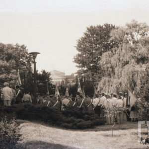 Poczty sztandarowe witające kondukt z doczesnymi szczątkami Ignacego Jana Paderewskiego na pl. Mickiewicza