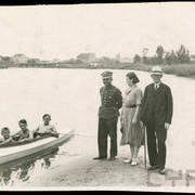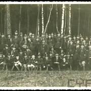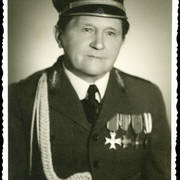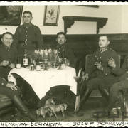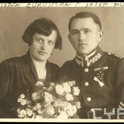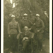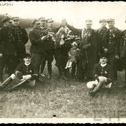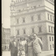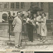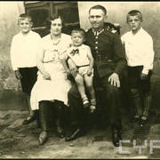 Plutonowy Józef Poprawski z 17. Pułku Ułanów Wielkopolskich z rodziną: pasierbem Henrykiem żoną Franciszką, synem Edkiem (siedzi na kolanach ojca) i pasierbem Kazimierzem prawdopodobnie przed domem przy ul. Królowej Jadwigi w Lesznie1930–1932