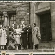 Uroczystośc 50-lecia pracy dziennikarskiej red. Henryka (?) Hryniewicza-Barańskiego (stoi tyłem) w budynku Prasy przy ul. Grunwaldzkiej 19, przed nim: Izabela Nowakowa, Leokadia Kończak i Stefania Cholewczyńska-Derwich1957