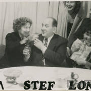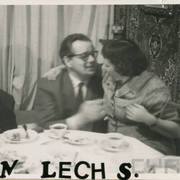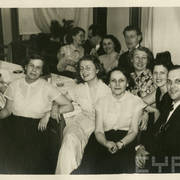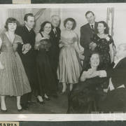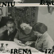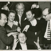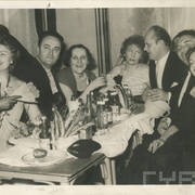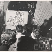 Stefania Cholewczyńska-Derwich (w środku), Stanisław Strugarek (po jej prawej stronie), Henryk Derwich (po lewej) i Lech Konopiński (u dołu) na imprezie sylwestrowej w budynku Prasy przy ul. Grunwaldzkiej31.12.1958