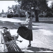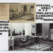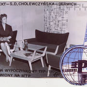 Stefania Cholewczyńska-Derwich na stoisku Cepelii na MTP, gdzie eksponowała meble swojego projektu w ramach Stolarni Ludowej; po lewej Lidia Krusznicka1959