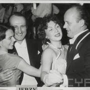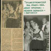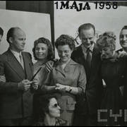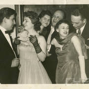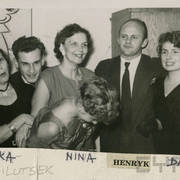 Jerzy Ofierski (Sołtys Kierdziołek), Stefania Cholewczyńska-Derwich, Urszula Paluszkiewicz, Henryk Derwich, Teresa Konecka i Bogdan Paluszkiewicz, konferansjer i dziennikarz, na balu w budynku Prasy przy ul. Grunwaldzkiej1958–1959