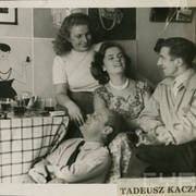 Henryk Derwich, Tadeusz Henryk Nowak, Irena Marcowa i Izabela Nowakowa na parapetówce w mieszkaniu młodej pary Stefanii i Henryka Derwichów przy ul. Armii Czerwonej 48/49 (dzisiaj Święty Marcin)05.1956