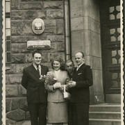 Jan Hasik (od lewej) z żoną Adą (Władysławą) i Stefan Marzec na imprezie w mieszkaniu młodej pary Stefanii i Henryka Derwichów przy ul. Armii Czerwonej 48/49 (dzisiaj Święty Marcin)05.1956