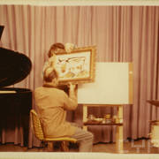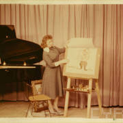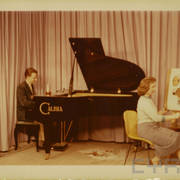Stefania Cholewczyńska-Derwich rysuje przed kamerami amerykańskiej telewizji kolorowej w pawilonie Stanów Zjednoczonych na Targach Poznańskich, na fortepianie akompaniuje Jerzy Milian06.1958
