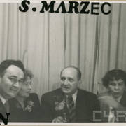 Stefania Cholewczyńska, Mieczysław Skąpski, Henryk Derwich i nn na zabawie w w siedzibie "Głosu Wielkopolskiego" w budynku Prasy przy ul. Grunwaldzkiej1956