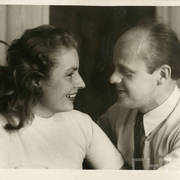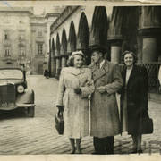 Ada Hasikowa (od lewej), Stefan Marzec, Stefania Cholewczyńska-Derwich (za kotarą) i Henryk Derwich na imprezie w mieszkaniu młodej pary Derwichów przy ul. Armii Czerwonej 48/49 (dzisiaj Święty Marcin)05.1956